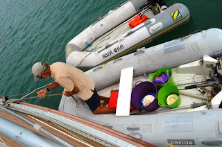 And, the amusing thing was, I was far too sick to even contemplate the cooking of our contribution so Paul came to the rescue. Now you must understand that although Paul makes an excellent cup of tea and a fair scrambled egg, that about sizes up his culinary skills (oh, I mustn't forget the occasional warming of a tin of beans) so now you have me, prone in the aft cabin trying to talk him through making a double batch of hummus and two lemon meringue pies. Well, congratulations to the dear man, he did a sterling job and certainly saved the day for Calypso